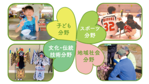 私たちは、①子ども分野、②地域社会分野、③スポーツ分野、④文化・伝統技術分野、の4つの分野で活動する団体を支援しています。