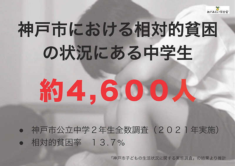 2021年、神戸市が中学2年生とその保護者を対象に全数調査を行った結果、子どもの7人に1人にあたる約4,600人が相対的貧困状態にあることがわかりました。