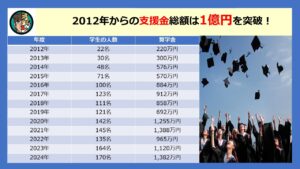 2012年からこれまでに、のべ1382名の学生に総額1億895万円の支援金を届けることができました。