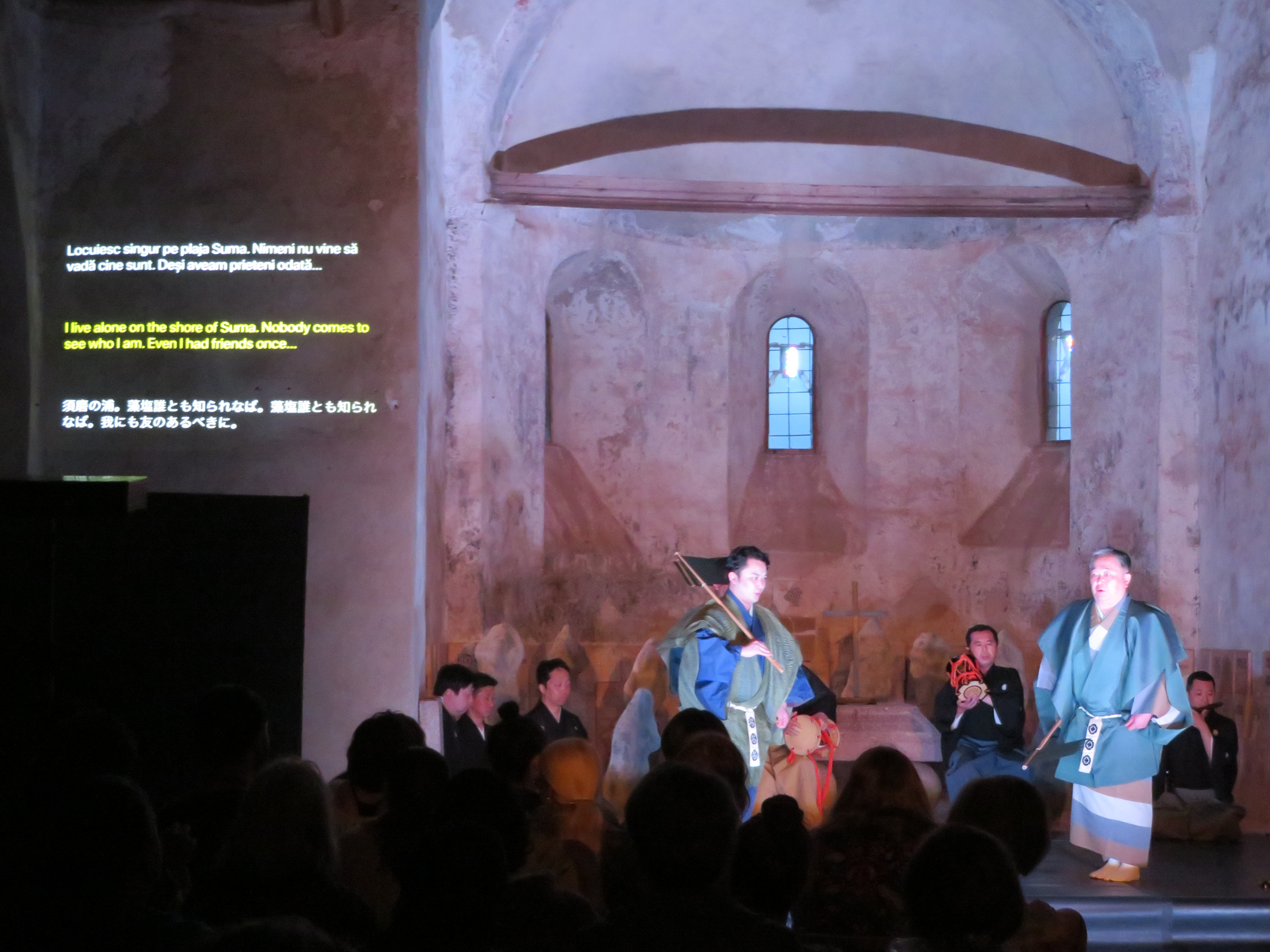 教会内部には、ここで戦死した兵士たちの慰霊碑が祭壇を取り囲んでおり、演劇祭の総監督から「能は魂の鎮魂のための芸能なので、兵士のために能を舞ってほしい」との要請を受け、世阿弥作の『平家物語』を題材に、笛の名手であり、若くして命を落とした『平敦盛』をテーマにした能『敦盛』を上演しました。