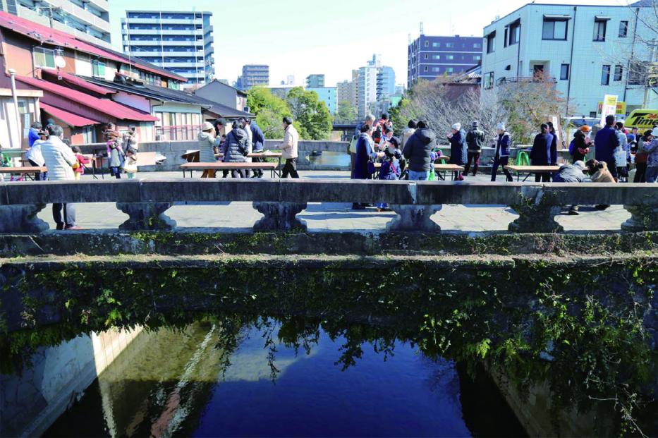 新町古町の復旧復興を目的としたコミュニティ応援イベントを開催しました。参加者に明八橋で下町の未来を語ってもらいました。
