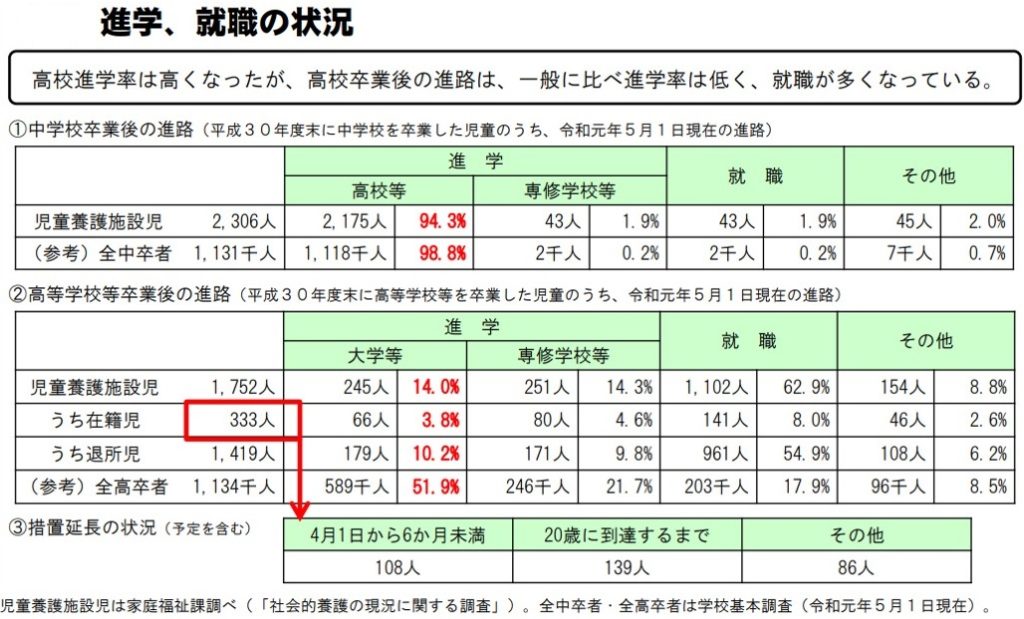 それを示す数字として、厚生労働省が発表した児童養護施設の子どもたちの進学率は、たった14%と、全高卒者の51%に対してはるかに低いのです。