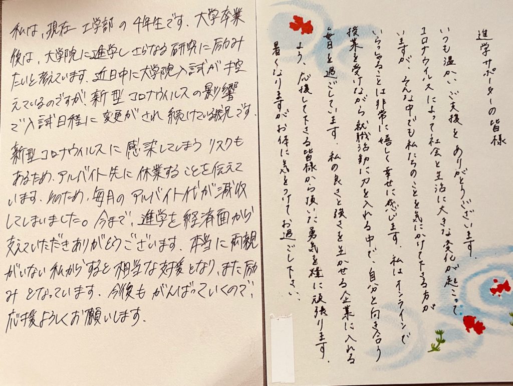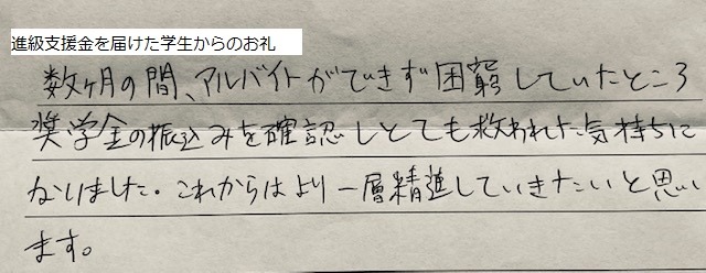 特に、コロナ禍においては、これまで以上に先の見えない不安を抱えているため、皆さまからのあたたかいご支援が学生たちの大きな励ましとなっています。