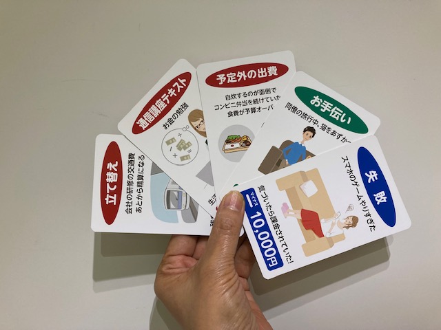 ▲ 止まるマスごとに引くカードには、 日常生活で起こりうる出費、アクシデント、 社会生活に関連して判断が必要なことが書かれています。