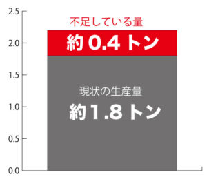 修復に必要とされる漆が年平均2.2tと試算される中、生産量が約1.2tでは、必要な供給量を達成するには単純計算で毎年約1tの増産が必要となります。