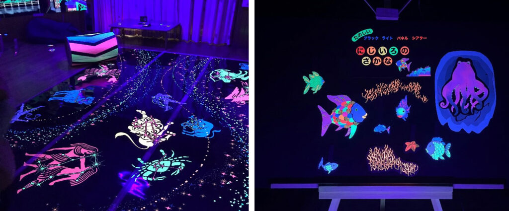 ▲スヌーズレン「ブラックライトルーム」(左)と「ブラックライトパネルシアター」(右)