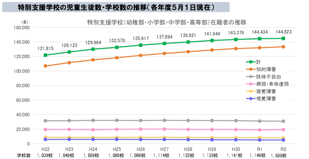 発達障害の児童が増加しており、特別支援学校で学ぶ子どもが14.4万人と過去最多になっています。また小学校の特別支援学級で学ぶ子どもも同様に増加しています。更に学校の授業が終わった後に通う放課後等ディサービスの事業所も急速に増加しています。