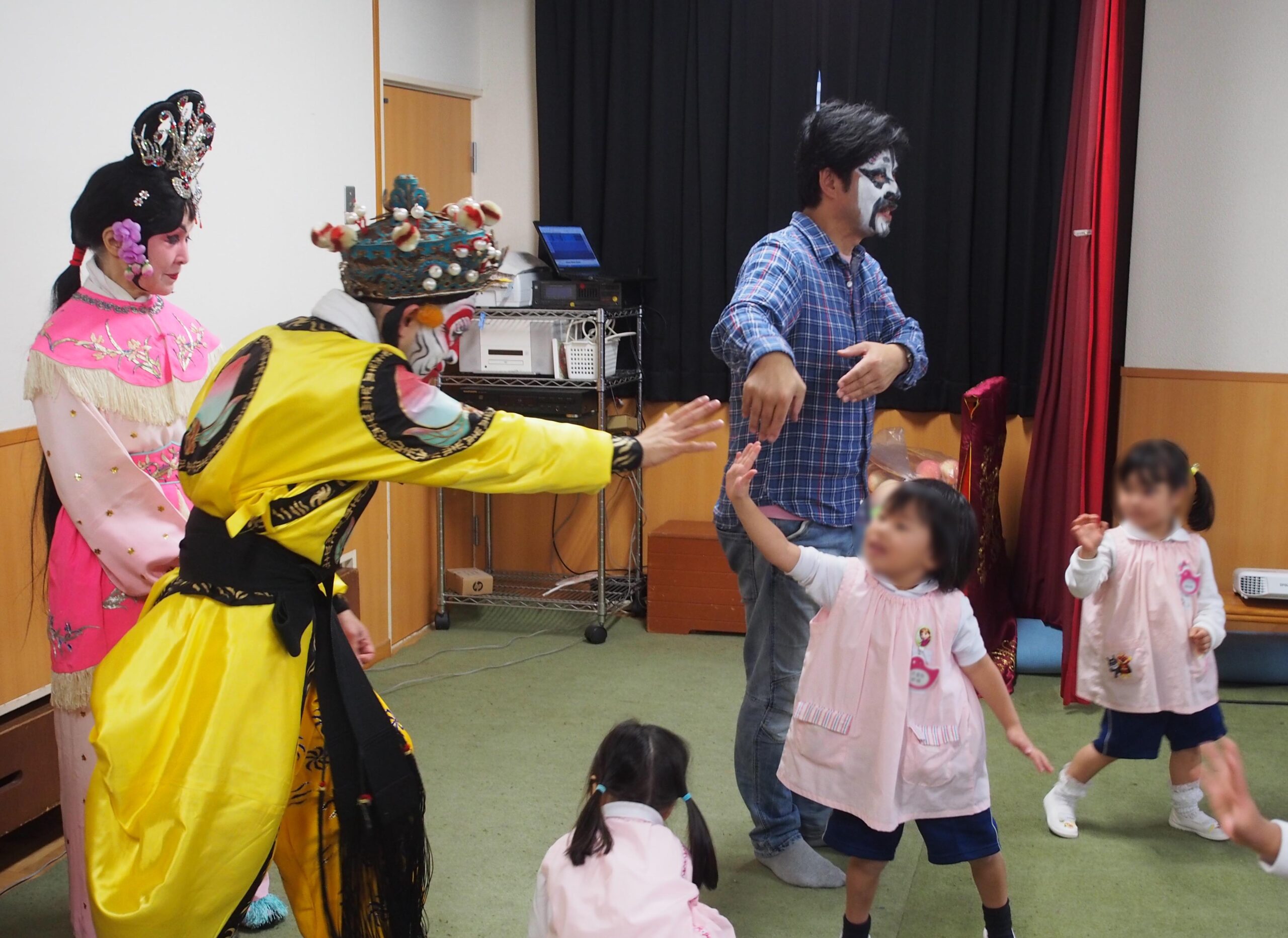 この状況改善に少しでも貢献するべく、会場設備を選ばず多くの環境で上演でき、またオーバーなリアクションで観客に情報が伝わるノンバーバル演劇としての側面を持つ京劇公演での慰問を推進します。