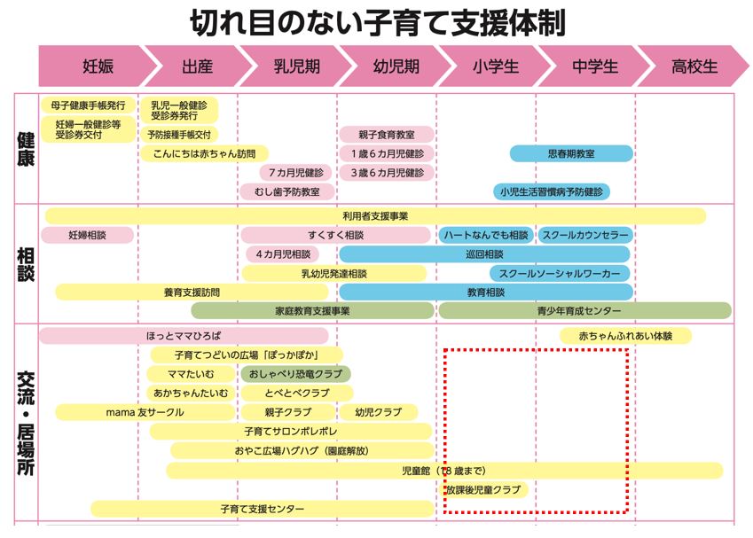 しかし、砥部町には現時点でこれらの取り組みは実施されていないため、利用するには、町外の施設に通う必要があります。遠方のため、母親が仕事を辞めて送り迎えをしている家庭もあります。(下記の砥部町の「切れ目のない子育て支援体制」を見てみると、「交流・居場所」に関して、小中学生、特に中学生の支援(赤い点線部分)は少ないことが分かります。)