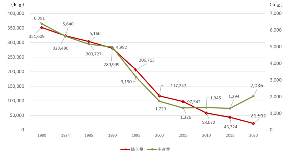 《漆の国内生産量・輸入量の推移(単位kg)》