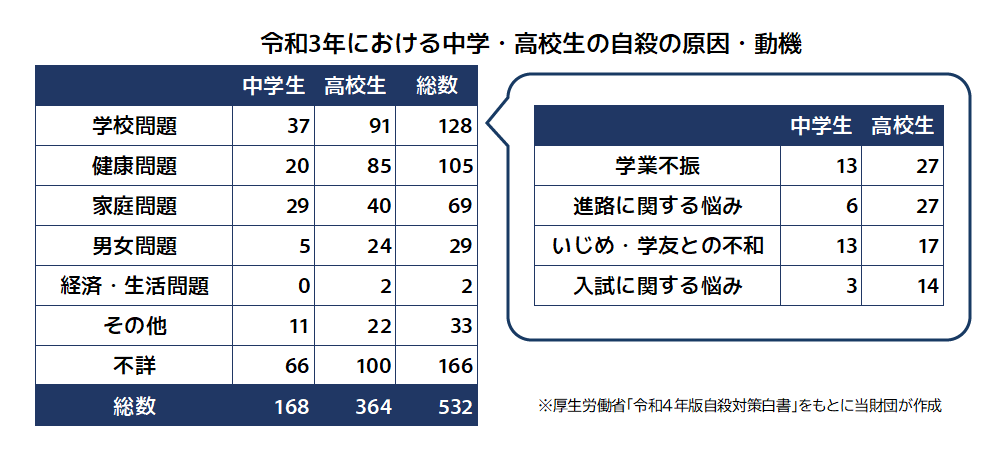 「学業の不振」や「進路に関する悩み」、「いじめ・学友との不和」などが挙げられています。
