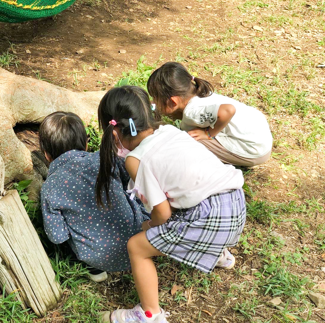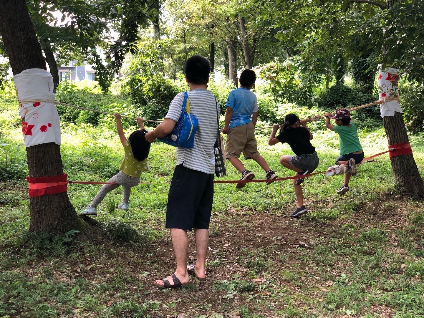 活動場所には手作りのハンモックやターザンロープ、畑もあります。めったにお目にかかれない貴重な植物が自生していたり、野鳥や昆虫をはじめ多様な生き物の姿を見ることもできます。近くに川遊びのスポットもあり、夏の暑い時期は最高の遊び場になっています。