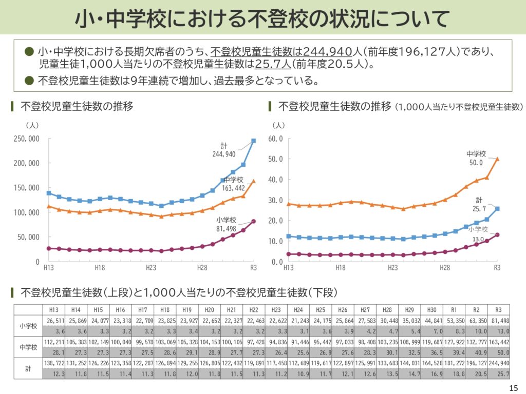 文部科学省の発表によると、不登校の小中学生は2021年度には約24万5000人となり、前年度から24%も増加しています。もともと学校生活に違和感を持っていた子どもたちが、コロナ禍による行動制限などにより、ますます息苦しさを感じるようになったと考えられます。また、特に小学生の不登校はこの5年ほどで2.5倍となり、低年齢の子どもたちにとって学校が安心できる場所ではなくなっていることがうかがえます。