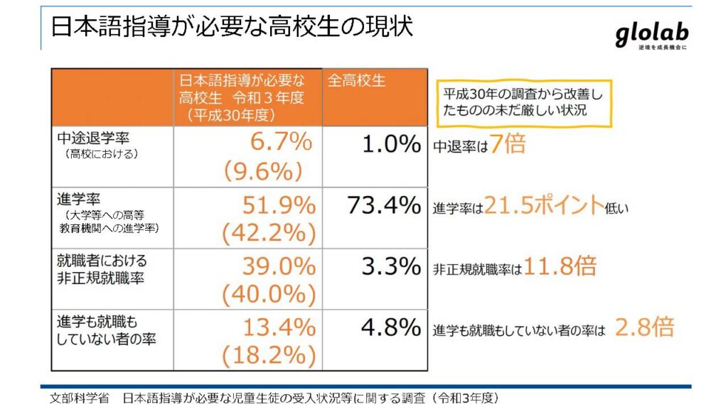 文部科学省が令和3年度に実施した「公立小・中・高等学校等における日本語指導が必要な児童生徒の受入状況等について調査の結果」によれば、日本の全高校生の大学や専門学校への進学率は71.4%であるのに対し、日本語指導が必要な高校生の進学率は51.9%で、21.5ポイント低く、進学も就職もしていない者の率は、全高校生が4.8%に対し日本語指導が必要な高校生は、13.4%と2.8倍となっています。