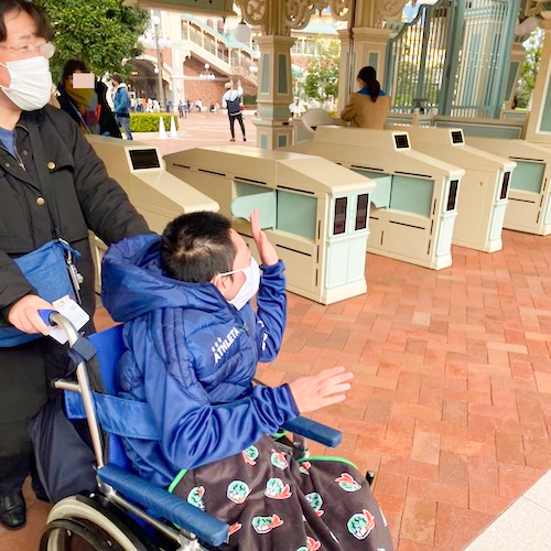 Linoツアーでは、各グループにサポートスタッフが付き添い、障がい者向けの「ディスアビリティアクセスサービス」の申込や、アトラクションに乗るための「エントリー受付」・「スタンバイパス」の発行、車いすからアトラクションへの移動補助など、ご家族が楽しむためのお手伝いをします。