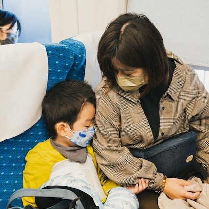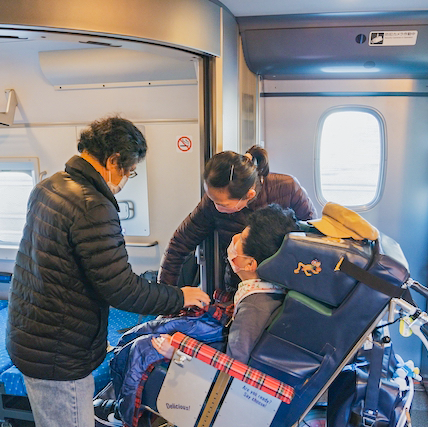 新幹線では、車いすのためのフリースペースのある車両を手配します。誤嚥防止のために食事をとる際に横になる必要がある子どももいますが、新幹線の車両の中には、横になることのできる多目的室もあります。現地では福祉タクシーで移動することで、長距離の移動を「できる」にします。