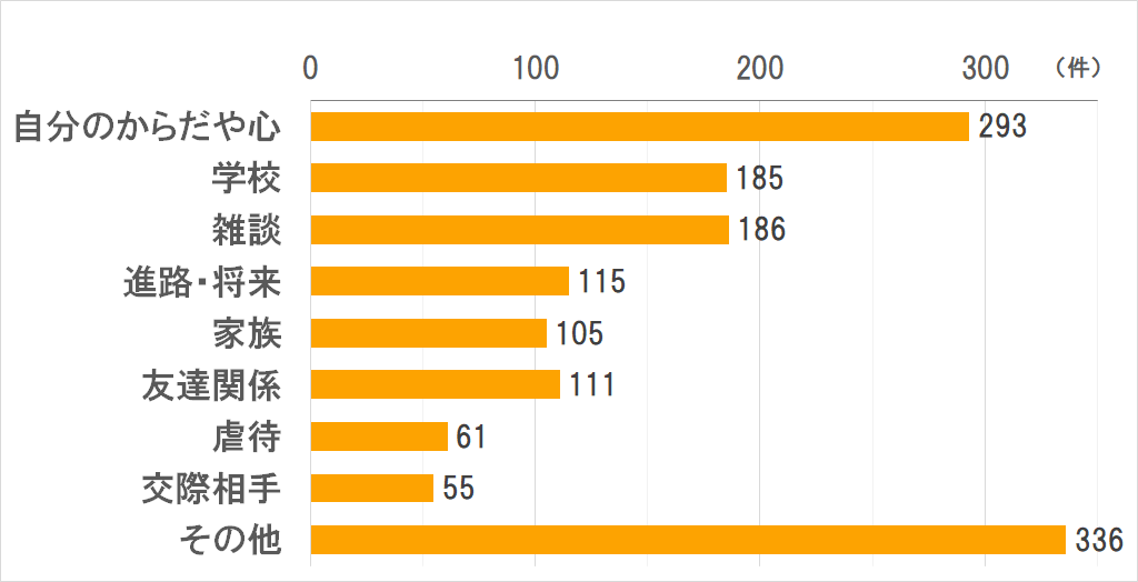また、「その他」には恋愛、自傷、いじめ、ネット関係、性暴力、デートDVなどの他に、どこにもカテゴリー分けできないものも多いことがわかりました。