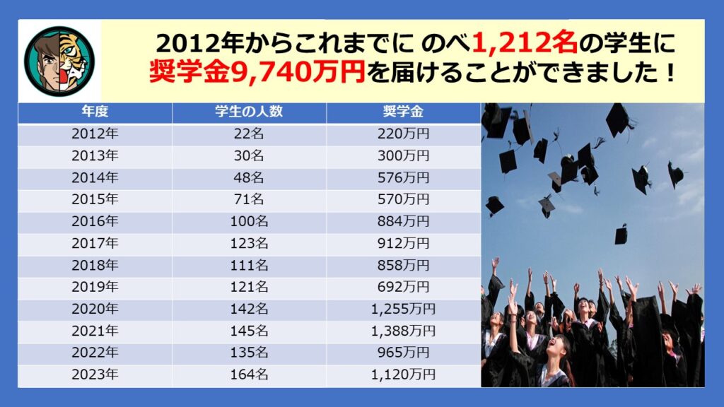 2012年からこれまでに、のべ1,212名の学生に総額9,740万円の支援金を届けることができました。