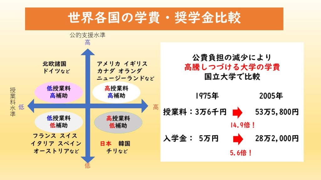 授業料が高く、奨学金制度などの補助も充実していなければ、大学進学は親の収入に左右され、家族に頼ることができない子どもたちの進学の機会が奪われていることになります。