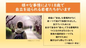 様々な事情で家族と離れて育った施設出身の子どもたちは、高校を卒業して施設を出ても、親元には戻れず、本人の意思や能力に関わらず自立を強いられます。