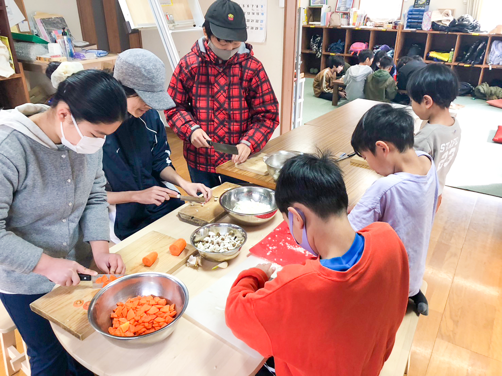 毎日の昼食は、子どもたちとスタッフが力を合わせて作ります。味噌汁には自分たちで仕込んだ味噌を使い、みんなで耕した畑で収穫された野菜が食卓に並びます。