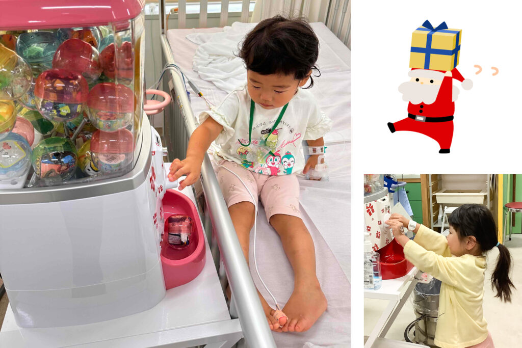 闘病中の子ども達のなかには、毎日痛みを伴う治療や辛いリハビリと向き合っている子達が沢山います。そんななか、「頑張ったらガチャガチャひけるよ!」という声掛けで、子ども達が泣くのをぐっと我慢して処置室に向かえたり、ガチャガチャまで行くことを目標に離床が進むなど、「ガチャガチャをひくというワクワク感」が子ども達に頑張る力を与えてくれていると、ドクターや看護師さん、保育士さん、そして付き添うご家族にもとても喜ばれています。
