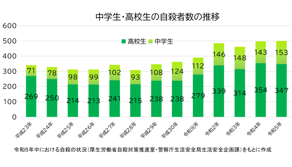 令和5年に自殺した中高校の児童・生徒は過去最多を更新した令和4年から更に3名の増加で500人となっています。