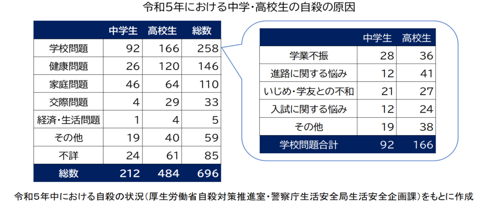警察庁と厚労省のまとめによると、中高生の自殺の理由は「学校問題」が最も多くなっており、その内訳は、「学業不振」が64件、「進路に関する悩み(入試以外)」が53件、「学友との不和(いじめ以外)」が48件でした。