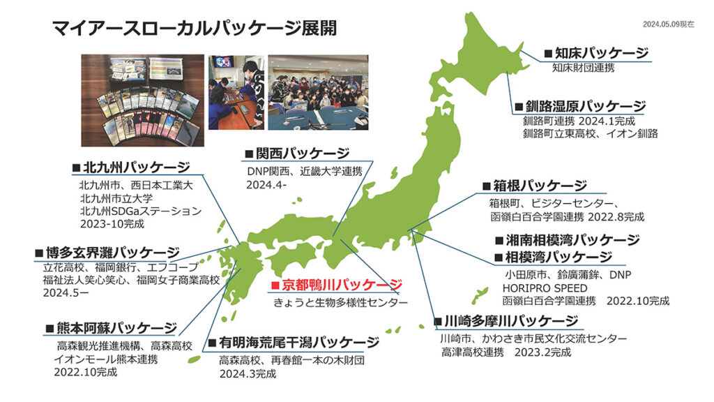 現在私たちは、子どもたちに環境問題についてより興味を持ってもらえるように、全国でその地域ならではの生態系を地域版「マイアース」としてカードゲーム化し、体験会や環境授業を実施しています。