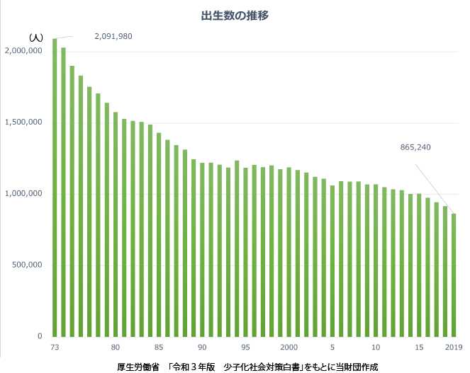 日本の総人口数はどんどん減少し、出生数も1973年は209万人だったのが、2019年には87万人にまで減少しています。