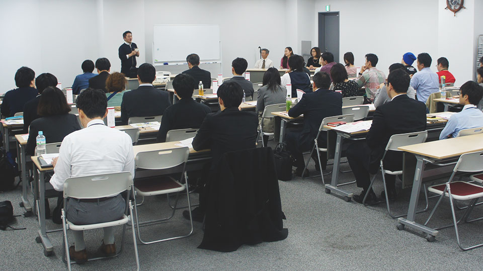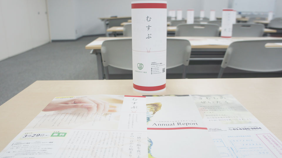 「祝結び」がプリントされた資料を筒状に丸めて、会場に立てて置きました。がらんとした会議室を少しでも明るく、変化のあるセミナーにしたいと思い基金スタッフでひとつひとつ資料を作成しました。