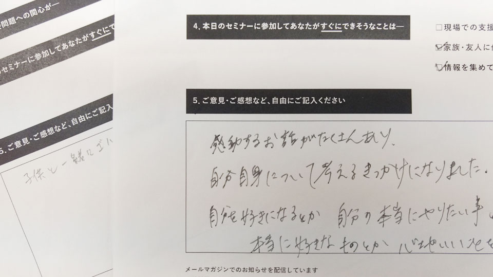 セミナー終了後、アンケートにご協力いただき、多くの方からご意見・ご感想、メッセージをいただきました。参加者のみなさまに、寄付や助成団体の活動について知ってもらい、考えていただくキッカケづくりが今回のセミナーの目的でもありました。