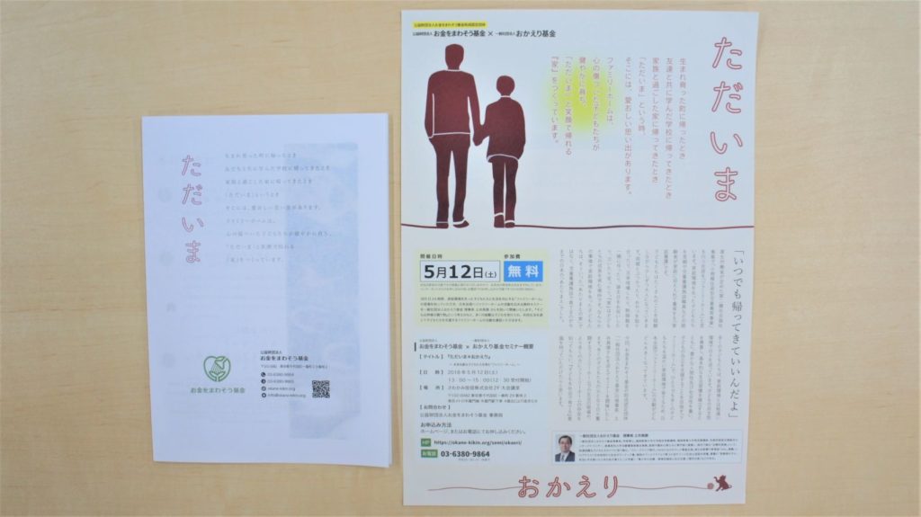 2018年5月12日、『ただいま*おかえり』~未来を創る子どもたちを育む「ファミリーホーム」~セミナーを開催いたしました。私たちは、助成先団体へお金をまわす役割だけではなく、活動を広めたり、人と人をつなぐことにも力を入れています。今回は、助成先団体の一般社団法人おかえり基金理事長 土井高徳さんを迎えてファミリーホームの生活の現場や存在を知る内容でした。