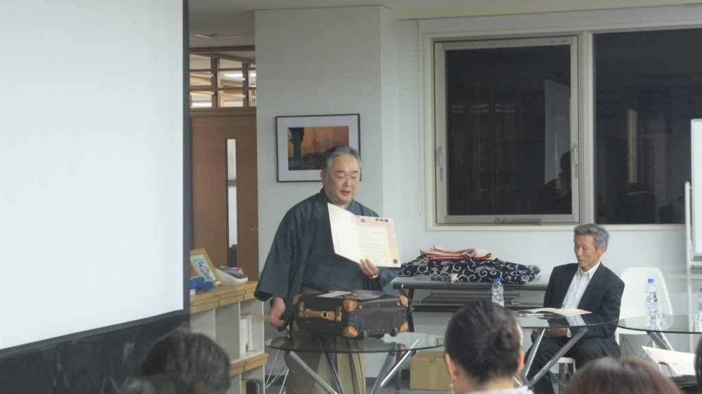 能の謡(うたい)の後は実際に使っている能面をみせていただきました。能面は非常に繊細で環境の変化に敏感な道具です。そのため保管する時は一つ一つ専用の袋に入れて保管されています。
