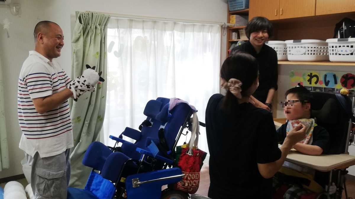 それが終わると『おやつ』『トイレ』『入浴』『体操・ストレッチ』を交互に行っていきます。スタッフ同士が連携して、子どもを車椅子から降ろしてトイレに連れて行ったり、車椅子にテーブルをセットしておやつを食べさせたりしています。また、なかなか落ち着きかない子はパペット(手人形)を使ってあやしています。