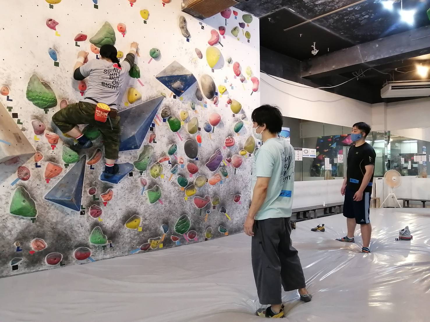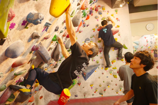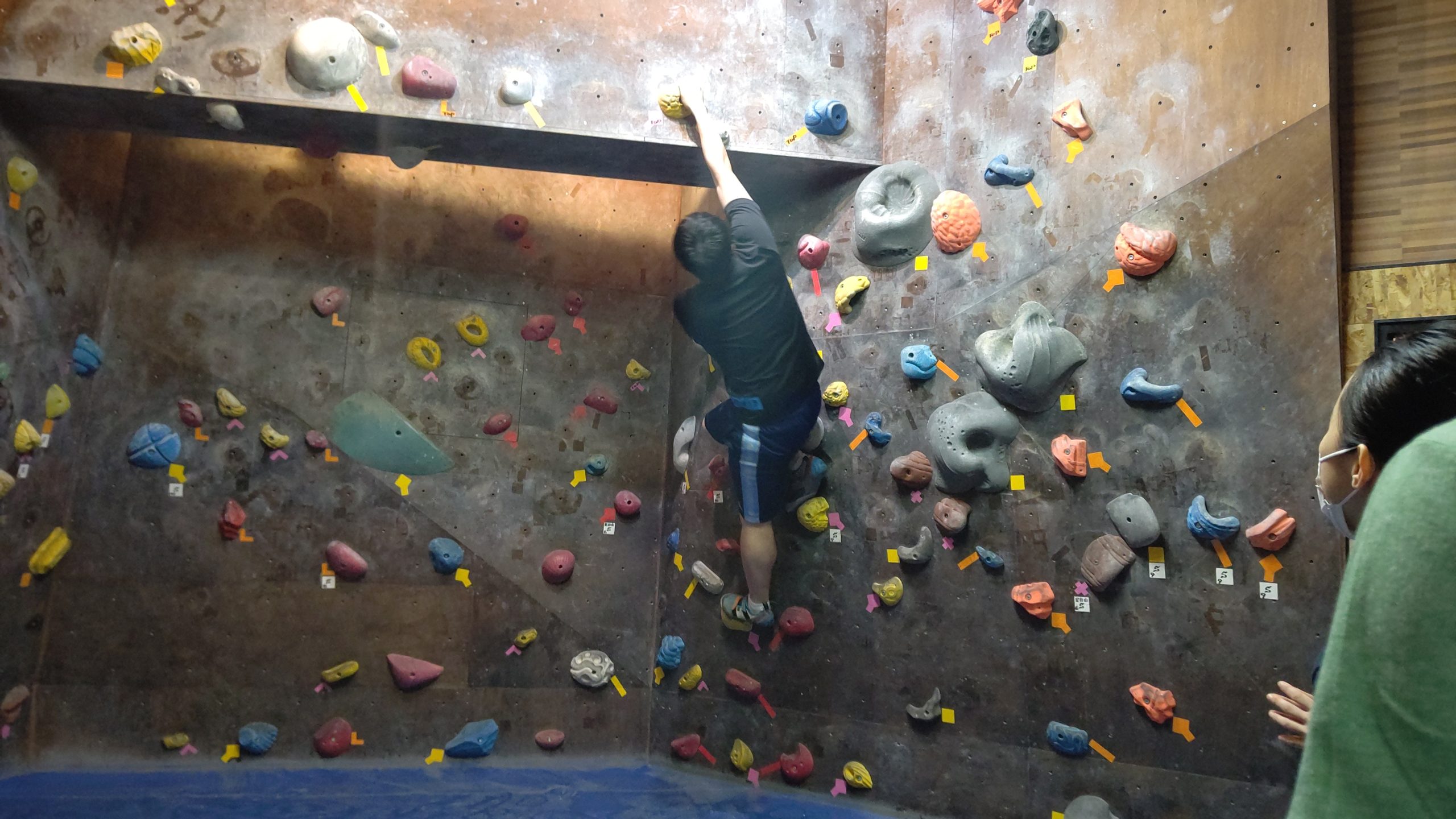 まずは一番易しいコースから始めます。スタッフやベテランの参加者がわかりやすく的確にナビゲートしてくださるので、二人とも無事にゴールのホールドを掴むことができました。