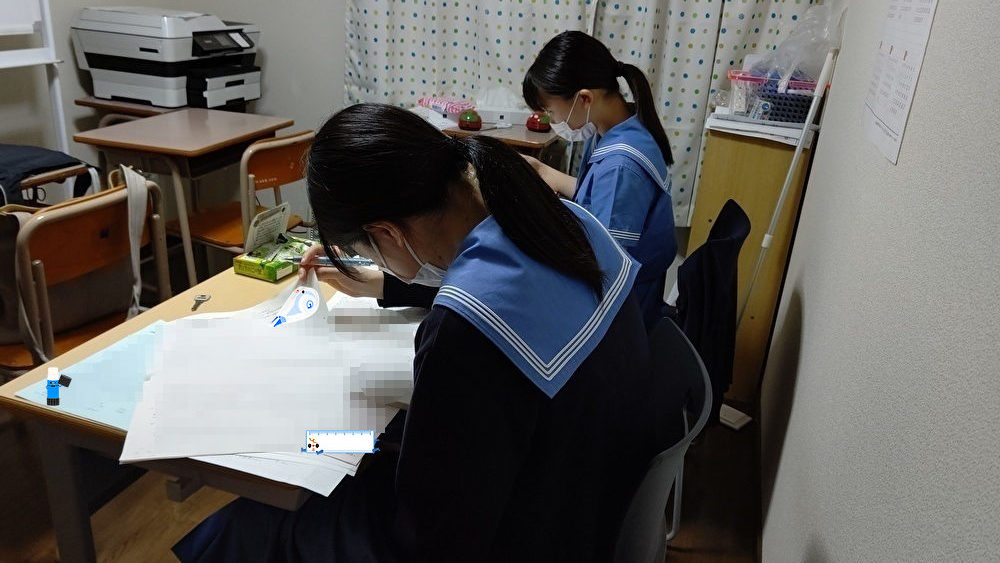 森さんのお話をお聞きするために自習室へ。そこには夏の空のような清々しいセーラー服姿の女子が二人。
