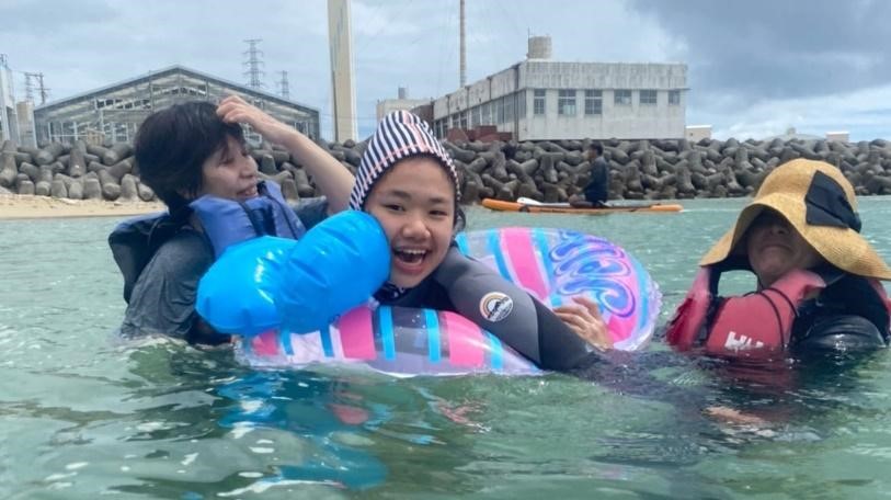 ビーチに出る前は、いつもと異なる環境で少し緊張気味だったお子さんたちも、海に入っているうちにどんどんリラックスしていきました。動きやすい水の中でバシャバシャと足をばたつかせたり、疲れたら浮き輪の中でうたた寝をしたり・・・と、とても楽しんでいる様子でした。