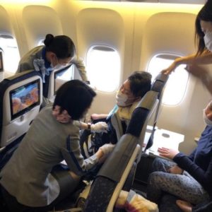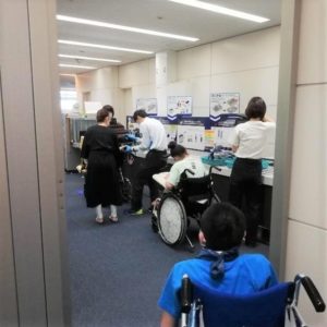 まず、障害のあるお子さんが日常的に利用している医療機器が、機内持ち込み可能なものかどうか、事前申請の内容と一致するかの確認。航空会社の担当の方が、メーカーや型番等を調べ本部と連絡を取り合う様子が見られました。また、機内に搭載できるか確認する為、車いすの大きさを計測します。今回は大きかったため、機内の通路も通ることができる車いすに途中で乗り換えることになりました。荷物を預け、チェックイン、飛行機に乗り込みます。