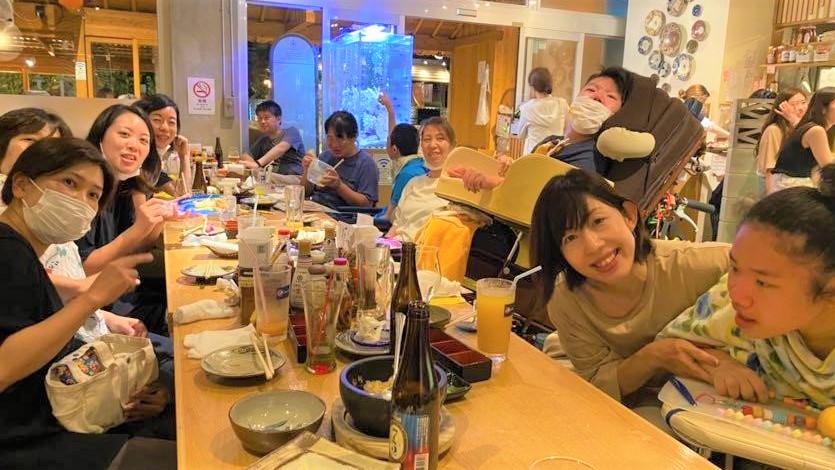 看護の現場で医療的ケア児の状況は知っていても、退院した後はどのようにケアされているのかは知らなかった。Linoでお手伝いすることで、とても勉強になっているとのこと。また、今回の旅行に参加した看護師の皆さんは、食事中も、東京で定期的に開催しているインクルシネマをどうやったらスムーズに運営できるか、今後の沖縄旅行をどのように改善していくかなどについて話し合っていて、Linoの活動に対する皆さんの熱い思いをヒシヒシと感じた夜でした。