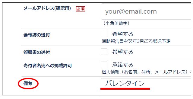 ・お名前や金額等を入力するページの備考欄に、「バレンタイン」とご記入ください。