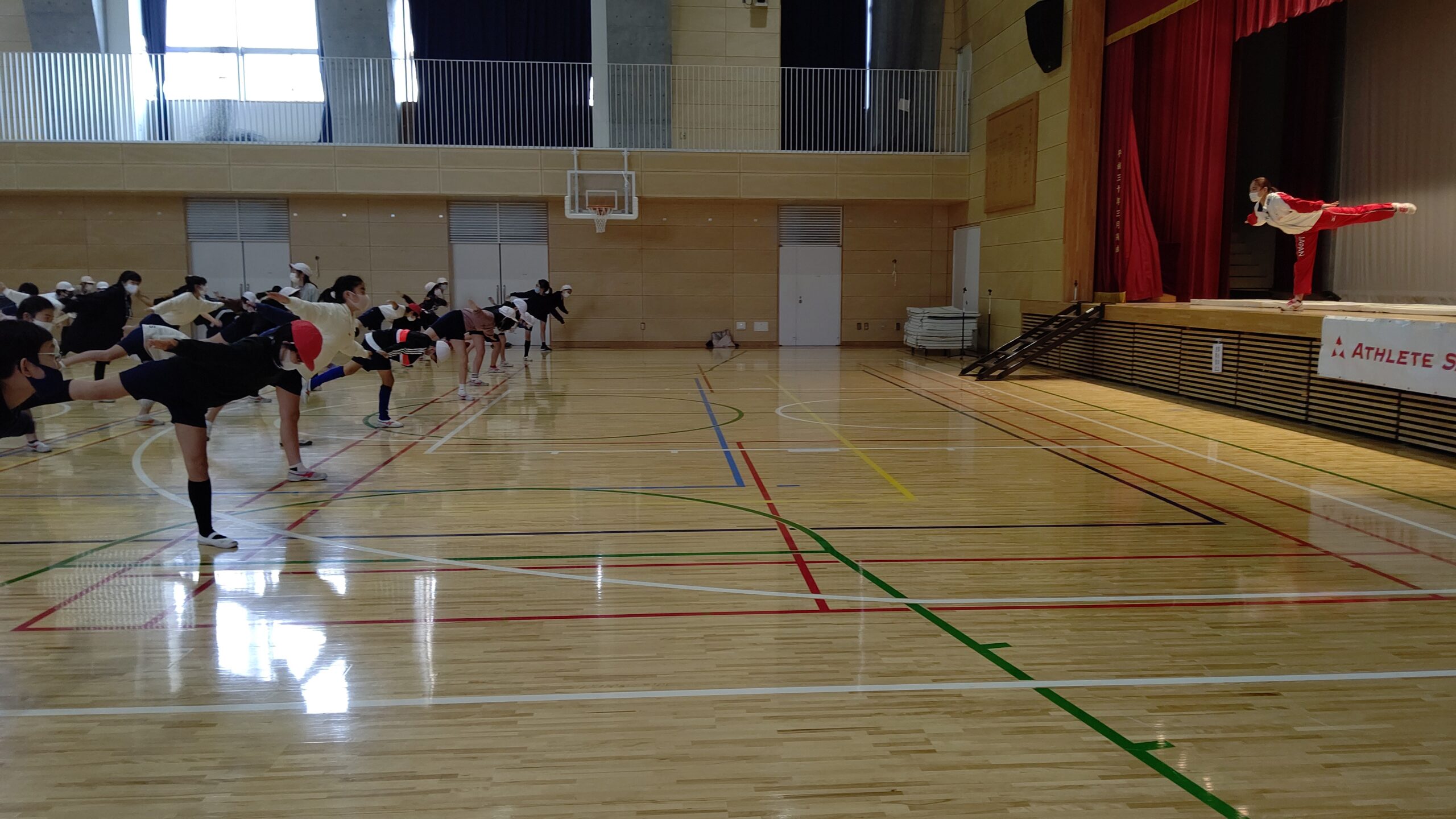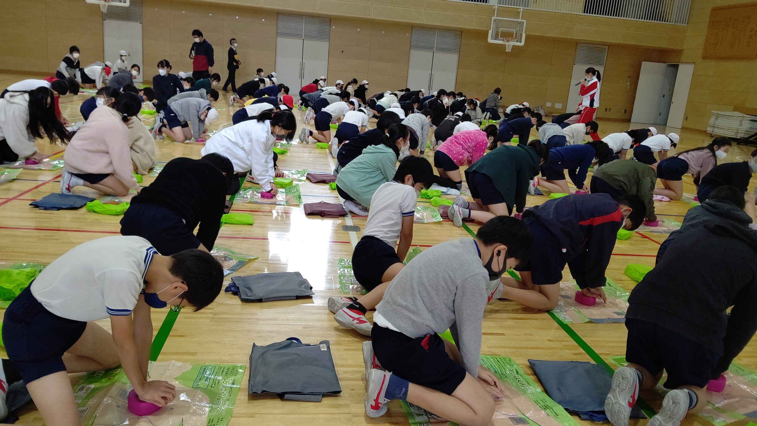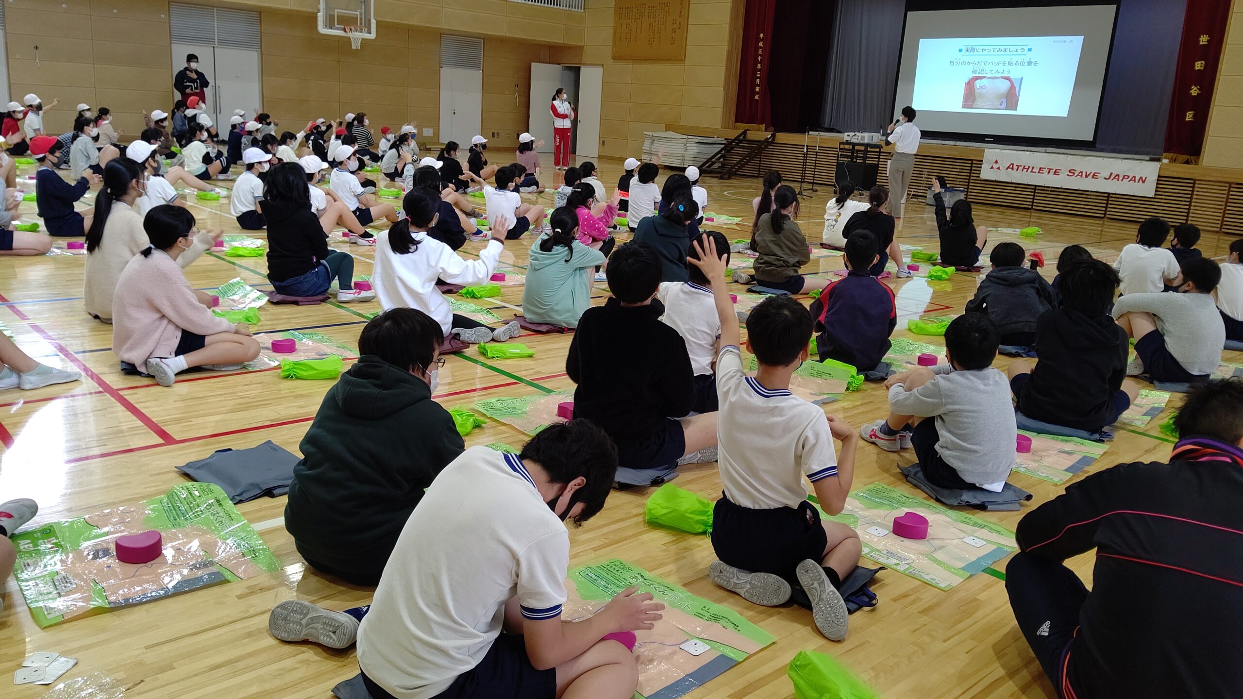 この日の受講者は6年生。110名ほどの児童が換気が万全な体育館に集合します。子どもたちはみな手足が長い。そして顔が小さい。大人のような体格の子もいますが、好奇心いっぱいの表情はあどけなくて素直そのものです。