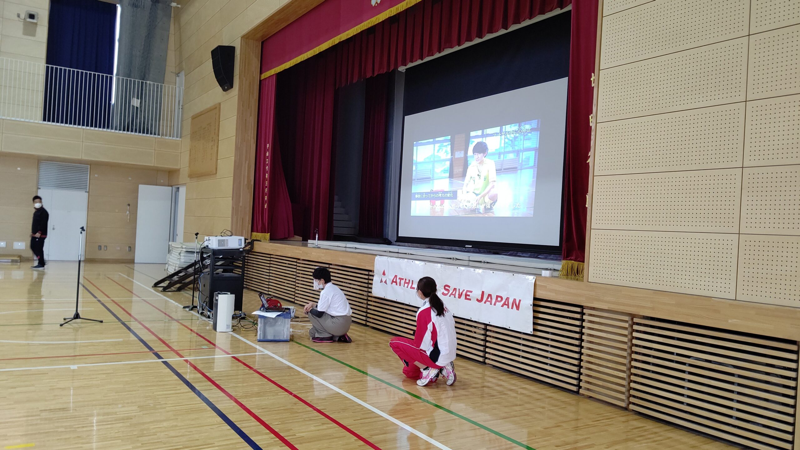 映像では倒れた人のためにAEDを取りに走った小学生の体験談なども流れます。子どもたちは真剣に映像を見つめ、飯塚さんの解説に耳を傾けます。