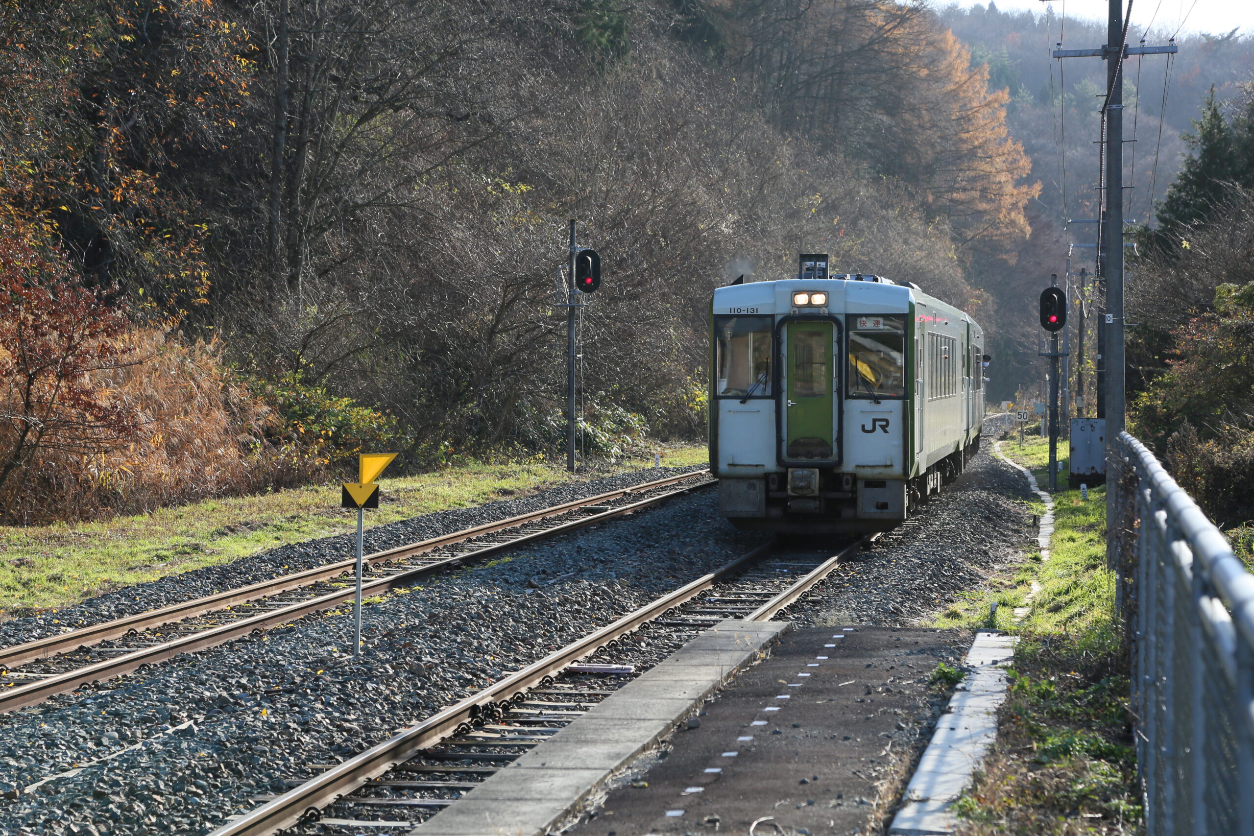 「漆の発信基地」上米内駅に入ってくるディーゼル車。盛岡市と宮古市を結ぶJR山田線は、全長102.1 kmを約2時間で走る単線です。