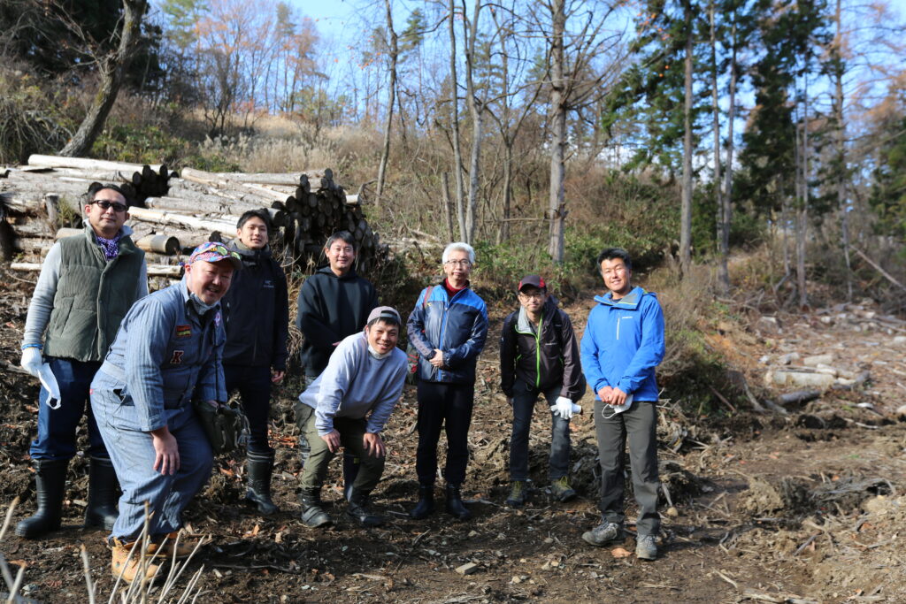 皆が腰をおろしているのは杉の切り株です。漆の森づくり(再造林)のために伐採された杉やカラマツは、原木市場やバイオマス発電の燃料などで役立てられています。