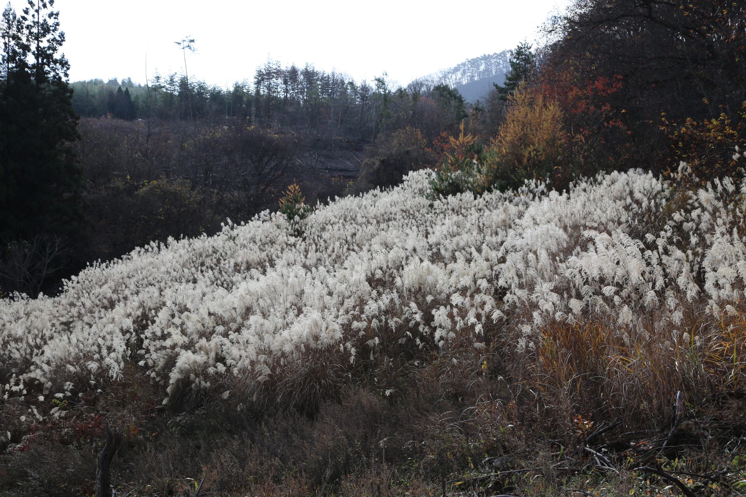 視線を上げるとススキの群生が銀色に輝いています。これから枯尾花は冬の風景に溶け込んでいきます。