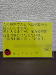 宿泊したホテルの部屋には「てんとう虫が侵入するので、長時間窓を開けないでください」という注意書きが置かれていました。