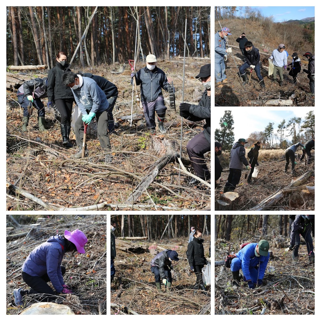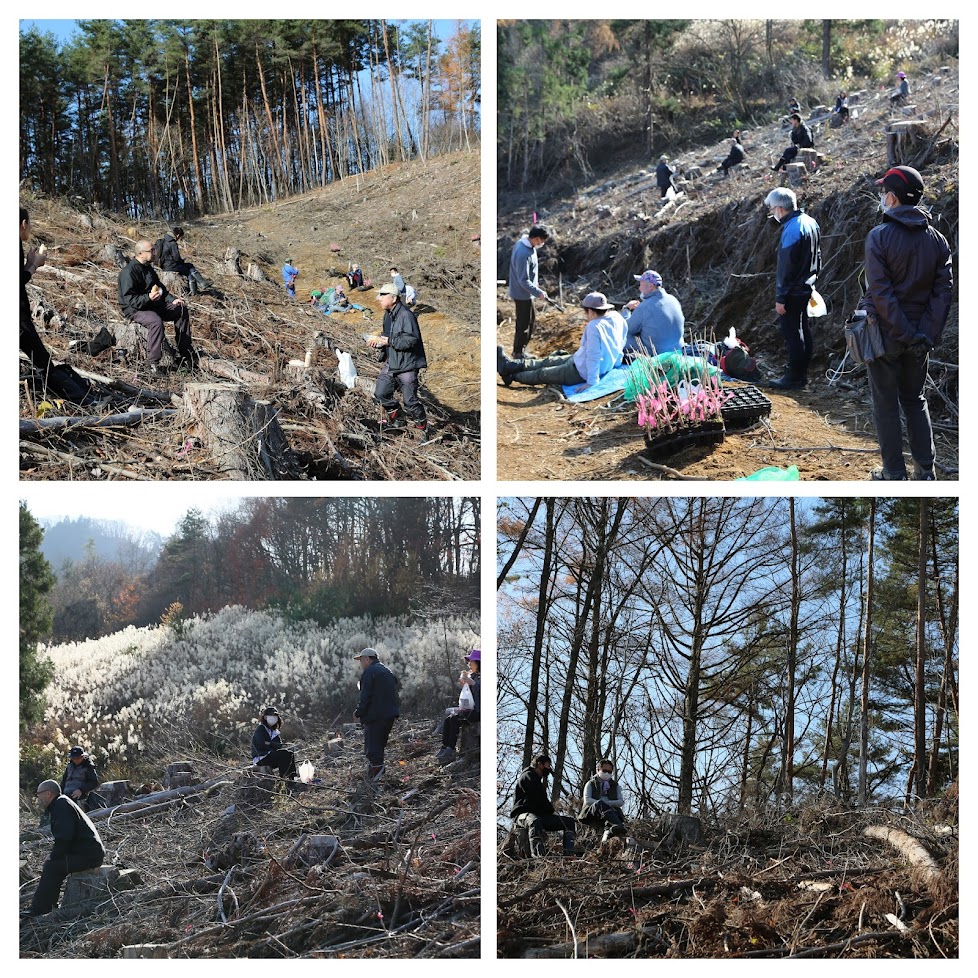 2mの計測をする人の後ろに4、5人がついて歩き、穴あけ、肥料、苗木、固定。作業の行列が山肌を登ったり下ったり。これ、マスクを着けた状態で長く続けているとけっこう大変です。途中で受け持つ作業を代わってもらいながら、ひたすら前の人を追いかけます。
