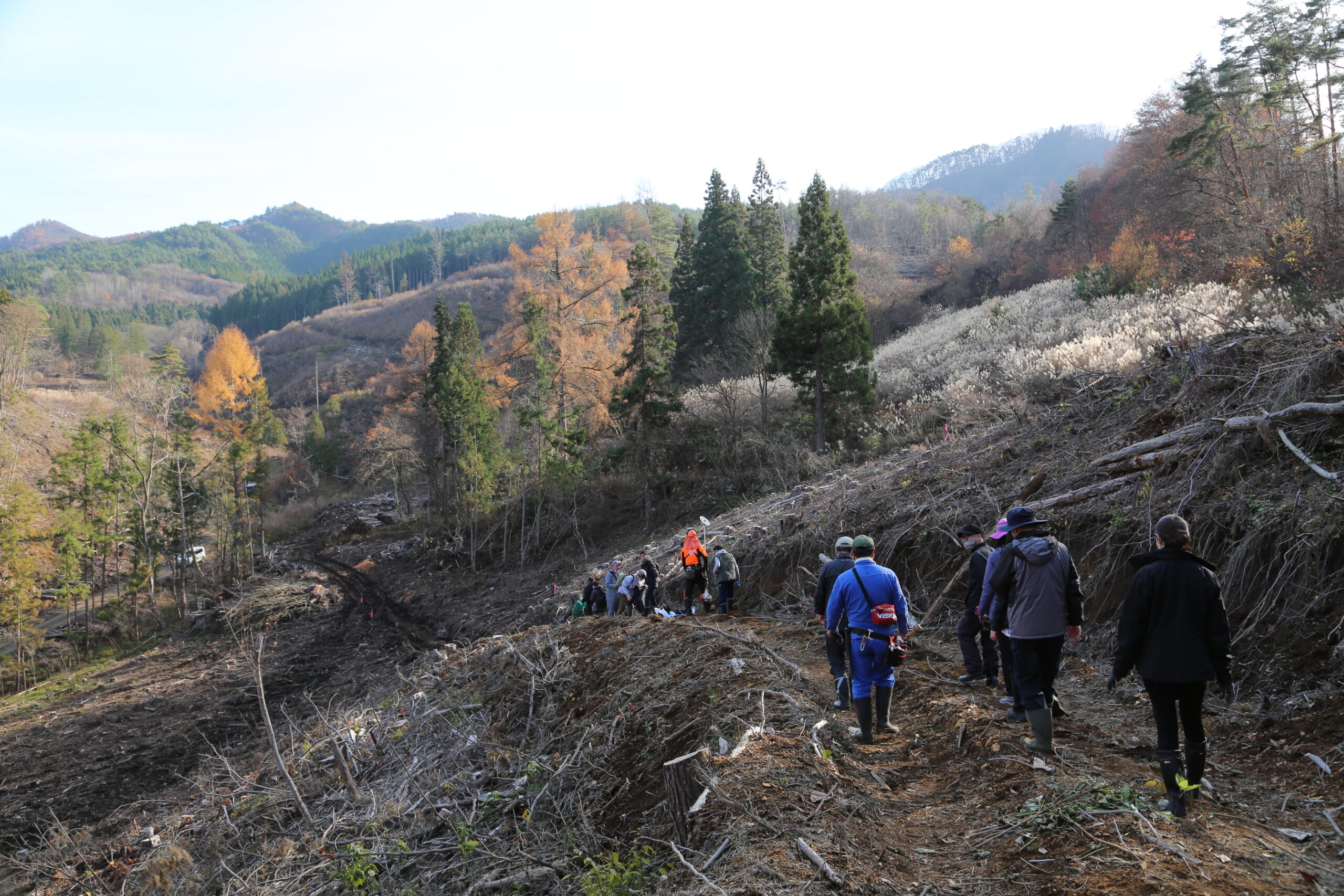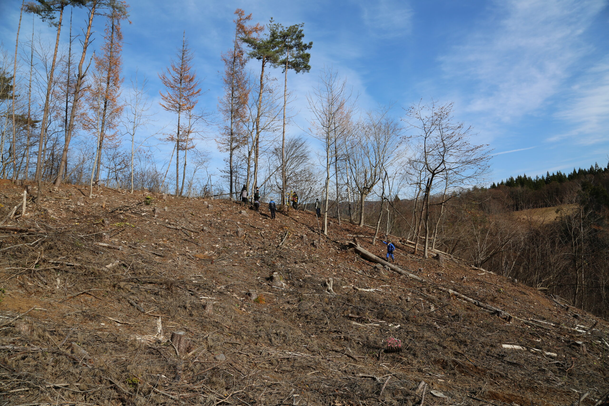 傾斜がきつい上に、枝や落ち葉などで足元は滑りやすい。枝先を踏むと反対の枝先が近くの人に当たることもあるので、慎重に足を運びながら植樹作業を続けます。