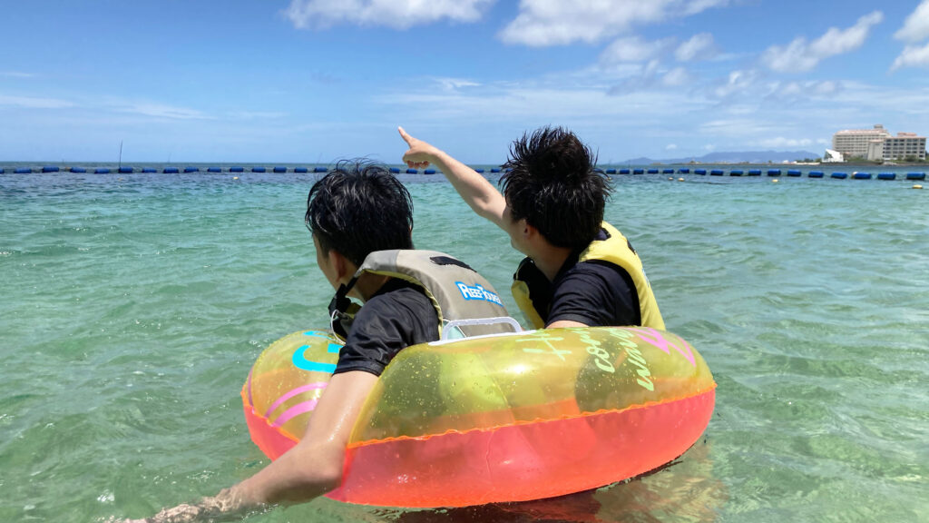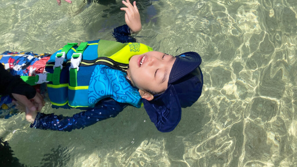 そんなNちゃんはお母さんと一緒に初めての水中ハンモックでリラックスした後、浮き輪を2重にして海の遊泳にも挑戦!